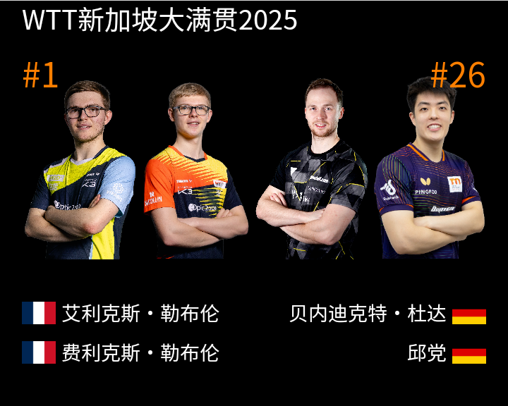 勒布伦兄弟是新科WTT年终总决赛男双冠军,也是世界第一。杜达/邱党则排名第26!赛前杜达表示:“我们从来没有在双打比赛中与勒布伦兄弟交过手,这肯定会是一场有趣而又高水平的比赛。”邱党和杜杜希望尽可能长时间地留在比赛中,包括为即将在5月多哈举行的世界锦标赛(5月17号至25号)练习。